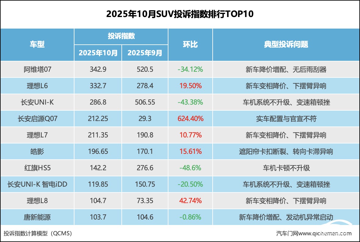 近日,汽車門網(wǎng)發(fā)布2025年10月投訴指數(shù)。其中SUV整體投訴指數(shù)達(dá)到6936.7,環(huán)比下降9%,這是由于投訴指數(shù)較高的幾款車型在本月出現(xiàn)了不同程度的下降。榜單TOP10車型中,理想汽車和長安汽車旗下均有三款車上榜,新車變相降價和車機(jī)系統(tǒng)不升級是上榜的主要原因。長安啟源Q07“來勢洶洶”,投訴指數(shù)暴漲624.40%,位居榜單第四,實車配置與官宣不符成為該款車投訴指數(shù)激增的主要原因。皓影是本月TOP10投訴榜單中唯一上榜的合資車,該款車的遮陽簾卡扣斷裂老問題仍然收到了集中投訴。