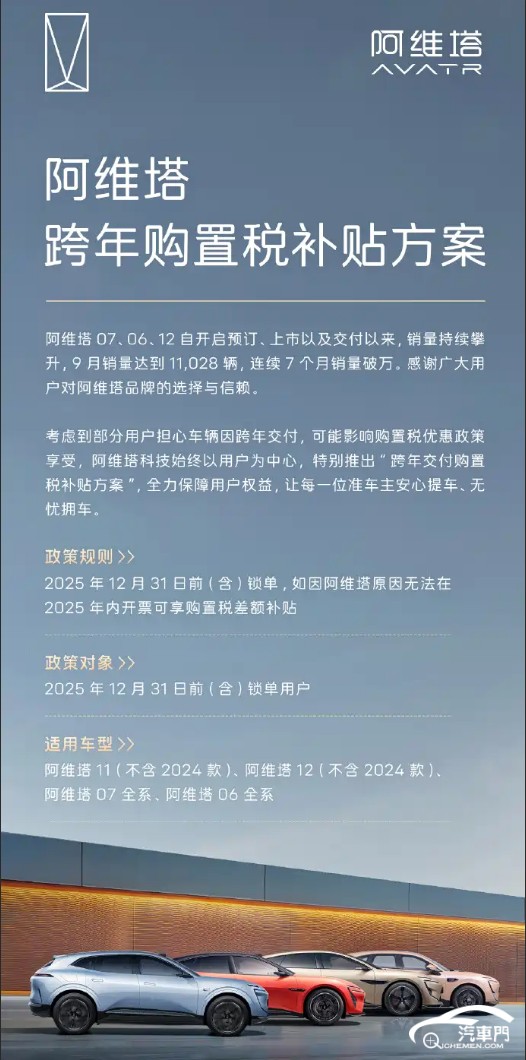 2025年12月31日前(含)鎖單,如因阿維塔原因無法在2025年內(nèi)開票可享購置稅差額補貼。2025年12月31日前(含)鎖單用戶,購買阿維塔 11(不含 2024 款)、阿維塔12(不含2024款)、阿維塔 07全系、阿維塔 06全系均可享跨年交付購置稅補貼。