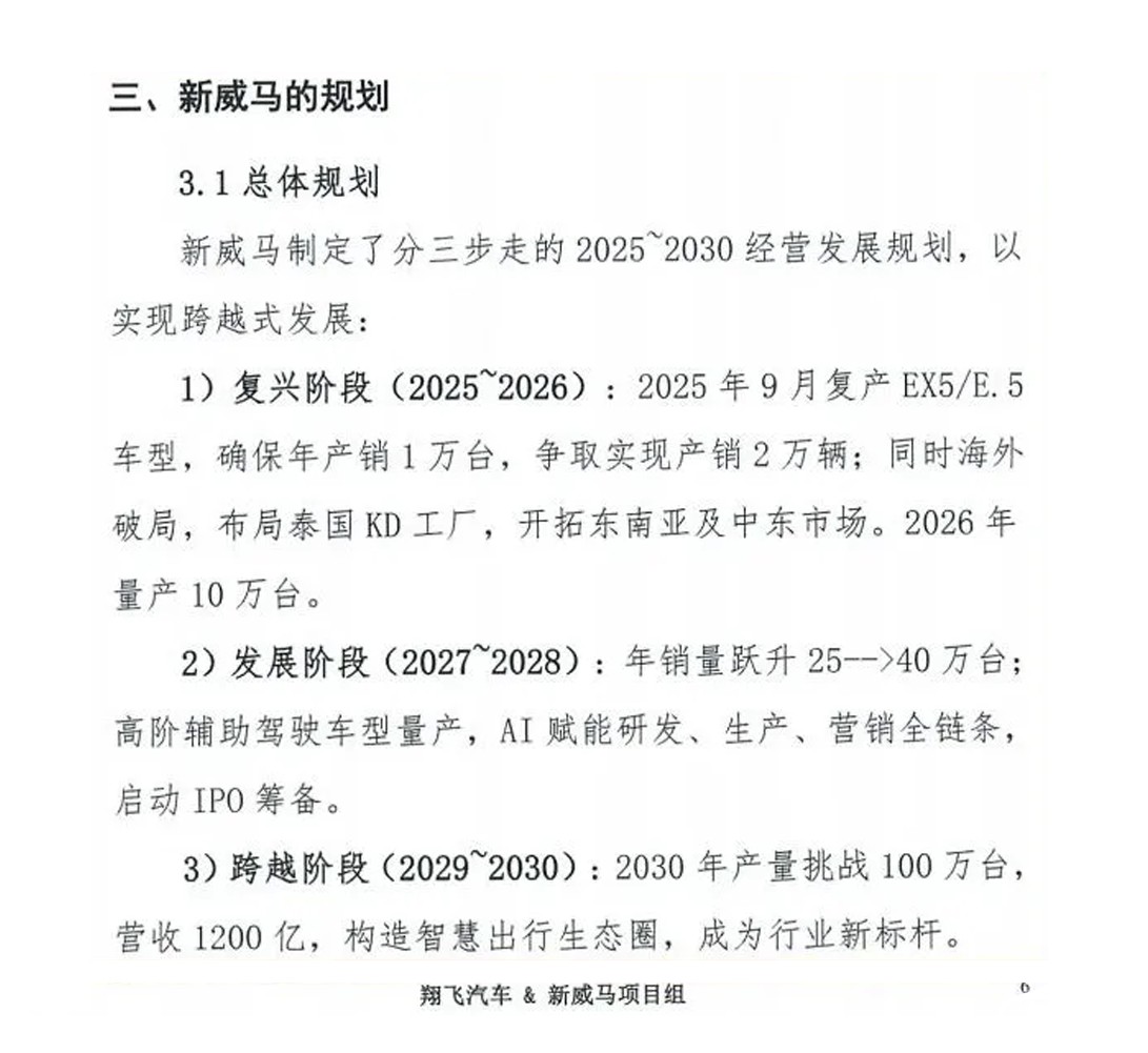 與此同時,威馬還制定了分三步走的2025年-2030年經(jīng)營發(fā)展規(guī)劃。這其中,2025年-2026年是復興階段,目標是今年9月復產(chǎn)EX5和E5車型,確保年產(chǎn)銷1萬輛并爭取實現(xiàn)產(chǎn)銷2萬輛。對應收入預計10億-20億元。另外,為了進一步拓寬收入來源,官方還將引入A00級轎車和小型SUV,合計產(chǎn)量1萬輛。海外布局也同步推進,威馬將依托泰國KD工廠開拓東南亞及中東市場。在此基礎上,官方計劃到2026年實現(xiàn)10萬輛的量產(chǎn)規(guī)模。