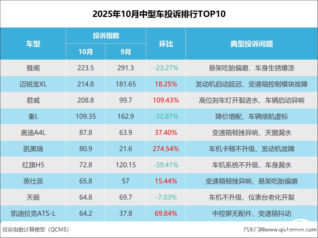 2025年10月中型車(chē)投訴指數(shù)排行:美系三車(chē)均有漲幅