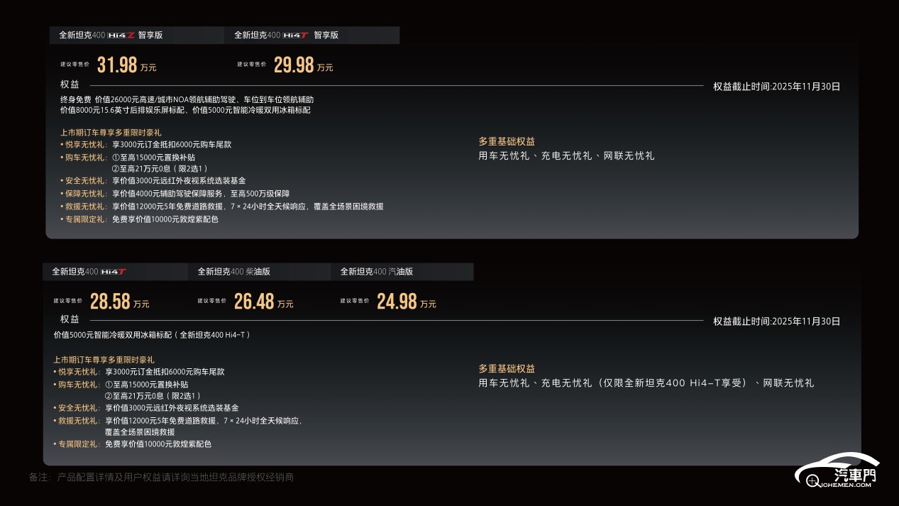 此次上市的全新坦克 400 推出五大版本,價(jià)格覆蓋 24.98 萬(wàn)元至 31.98 萬(wàn)元區(qū)間,全面滿足不同用戶的需求:汽油版 24.98 萬(wàn)元、柴油版 26.48 萬(wàn)元、Hi4-T 版 28.58 萬(wàn)元、Hi4-T 智享版 29.98 萬(wàn)元,以及 Hi4-Z 智享版 31.98 萬(wàn)元。即刻下單的用戶還可尊享多重購(gòu)車(chē)權(quán)益,坦克品牌以滿滿誠(chéng)意降低年輕用戶體驗(yàn)潮酷越野的門(mén)檻,讓更多人有機(jī)會(huì)擁有這款全能座駕。