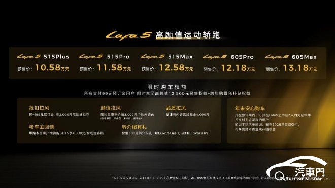 預(yù)售權(quán)益方面,2025年11月7日至零跑Lafa5上市發(fā)布會前,預(yù)付99元預(yù)訂金,限時享至高價值12500元預(yù)售權(quán)益+跨年購置稅補貼權(quán)益,具體權(quán)益如下:
