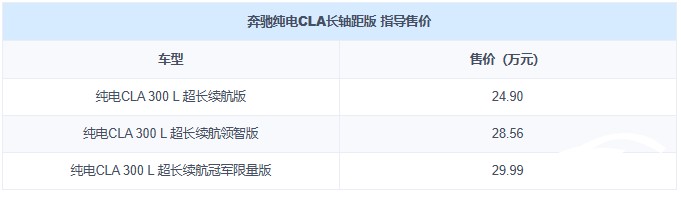 此前,在11月5日,全新奔馳純電CLA L超長(zhǎng)續(xù)航版已經(jīng)上市,共推出3款車型,售價(jià)區(qū)間為24.90-29.99萬元。超長(zhǎng)續(xù)航版本配備89kWh三元鋰電池,CLTC工況續(xù)航866km,并提供272馬力和224馬力兩種最大功率。